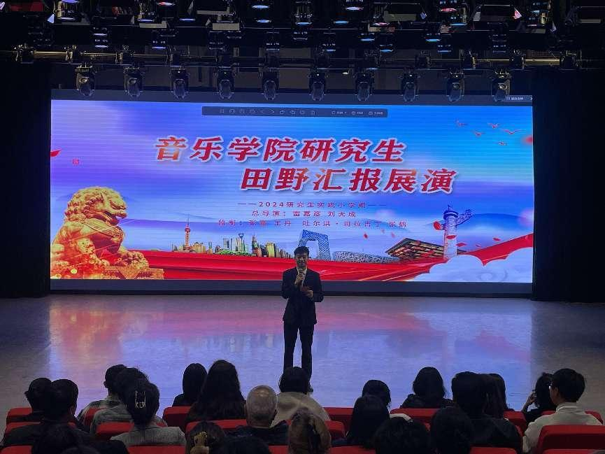 本次汇报会为2023-2024-3实践小学期田野调研的成果展示。今年6月,音乐学院20名硕士研究生在张赢、王丹、吐尔洪·司拉吉丁、张鹤4位导师们的带领下前往巴音郭楞蒙古自治州进行了为期一周的田野考察。