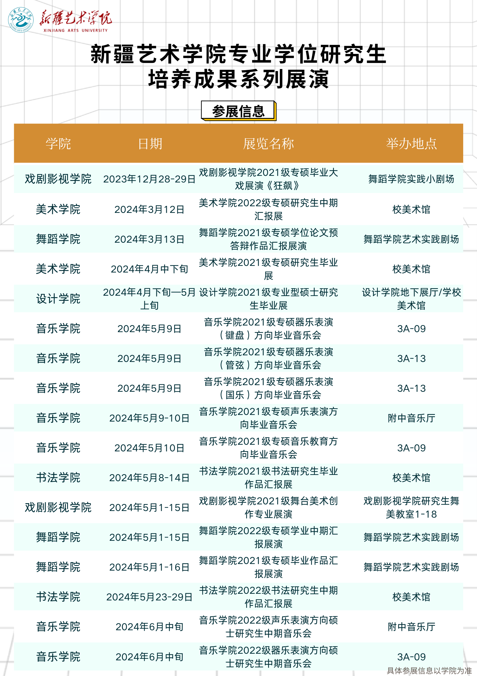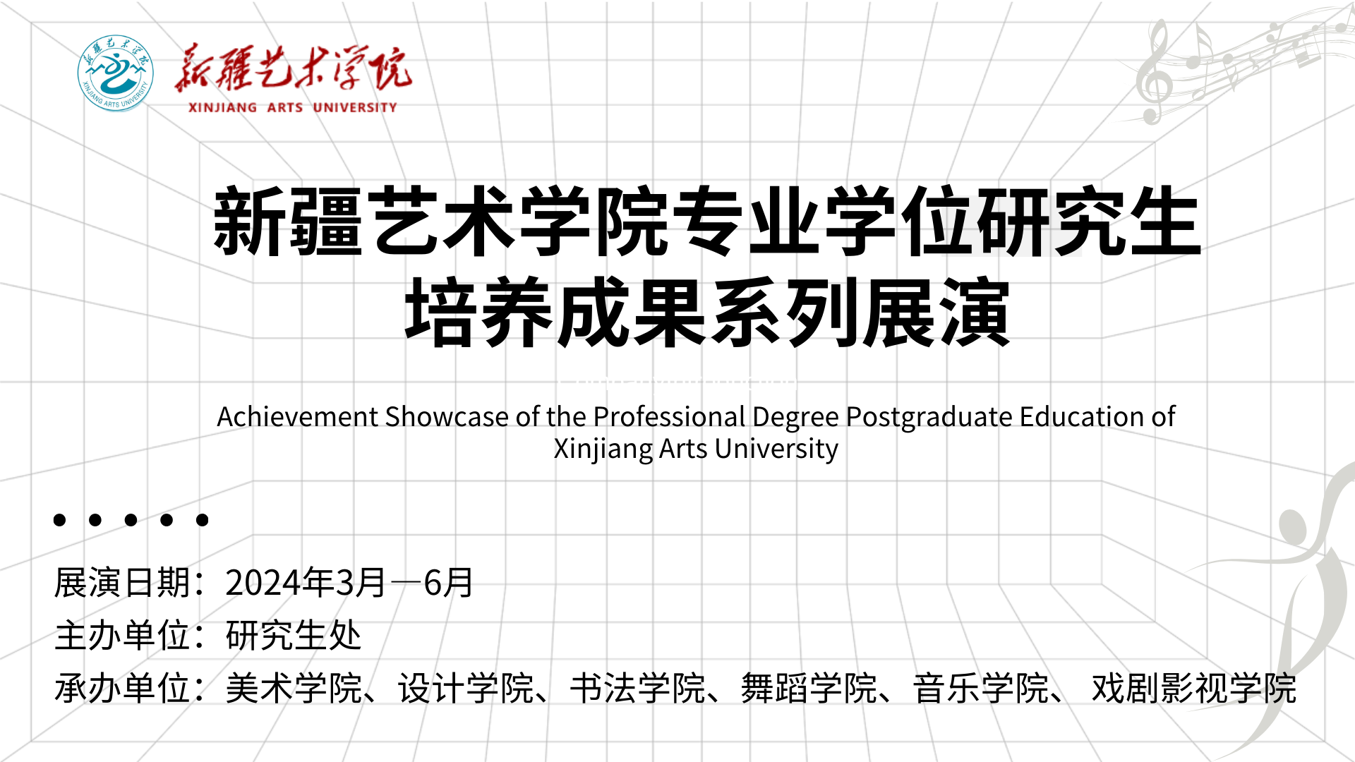 为进一步推进我校专业学位研究生培养体系建设,本学期由研究生处主办,美术学院、设计学院、书法学院、舞蹈学院、音乐学院、戏剧影视学院承办的“新疆艺术学院专业学位研究生培养成果系列展演”拉开帷幕。本次培养成果系列展演包括美术作品展、书法作品展、戏剧展演、舞蹈展演、音乐会等内容,全面生动地展现本年度专业学位培养单位的实践创新成果。