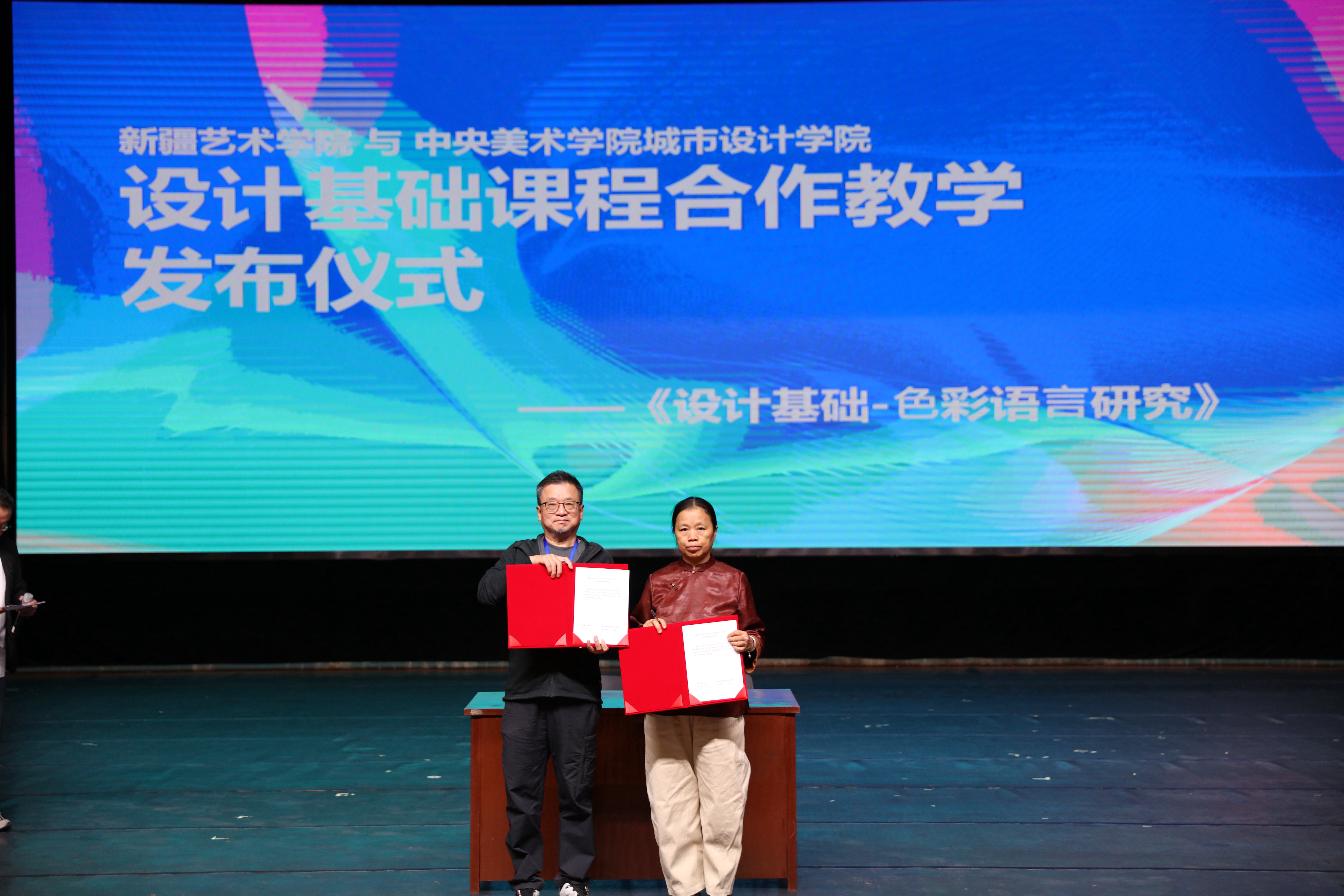 研讨会现场,还举行了新疆艺术学院设计学院与中央美术学院城市设计学院《设计基础—色彩语言研究》联合课程发布仪式。