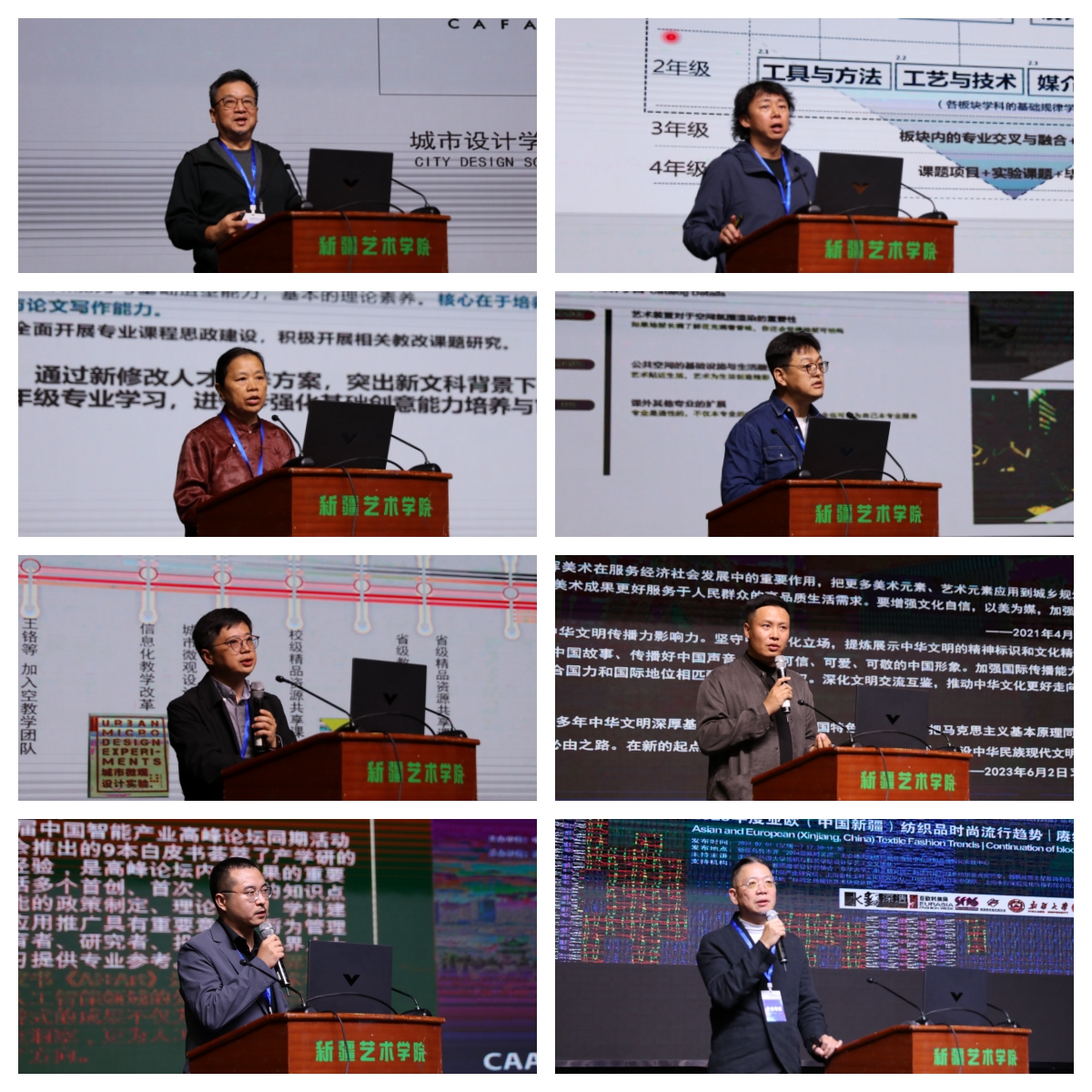 其中,田伟、张从云、周云、丁硕赜、王铬、武定宇、曲光复、沈沉分别以《中央美术学院城市设计学院教学结构》《中央美术学院城市设计学院基础部一年级课程教学介绍》《传承创新 民生设计向未来——新疆艺术学院设计学专业教育改革与发展》《公共艺术设计教育中的在地性、数字化和情感》《空间图学——环境设计学群基础教学探索与实践》《从广告设计走向传播设计》《未来已来:探索AI与设计教育的融合之路》《AI人工智能下的亚欧(中国新疆)纺织品时尚流行趋势》为题进行交流发言。