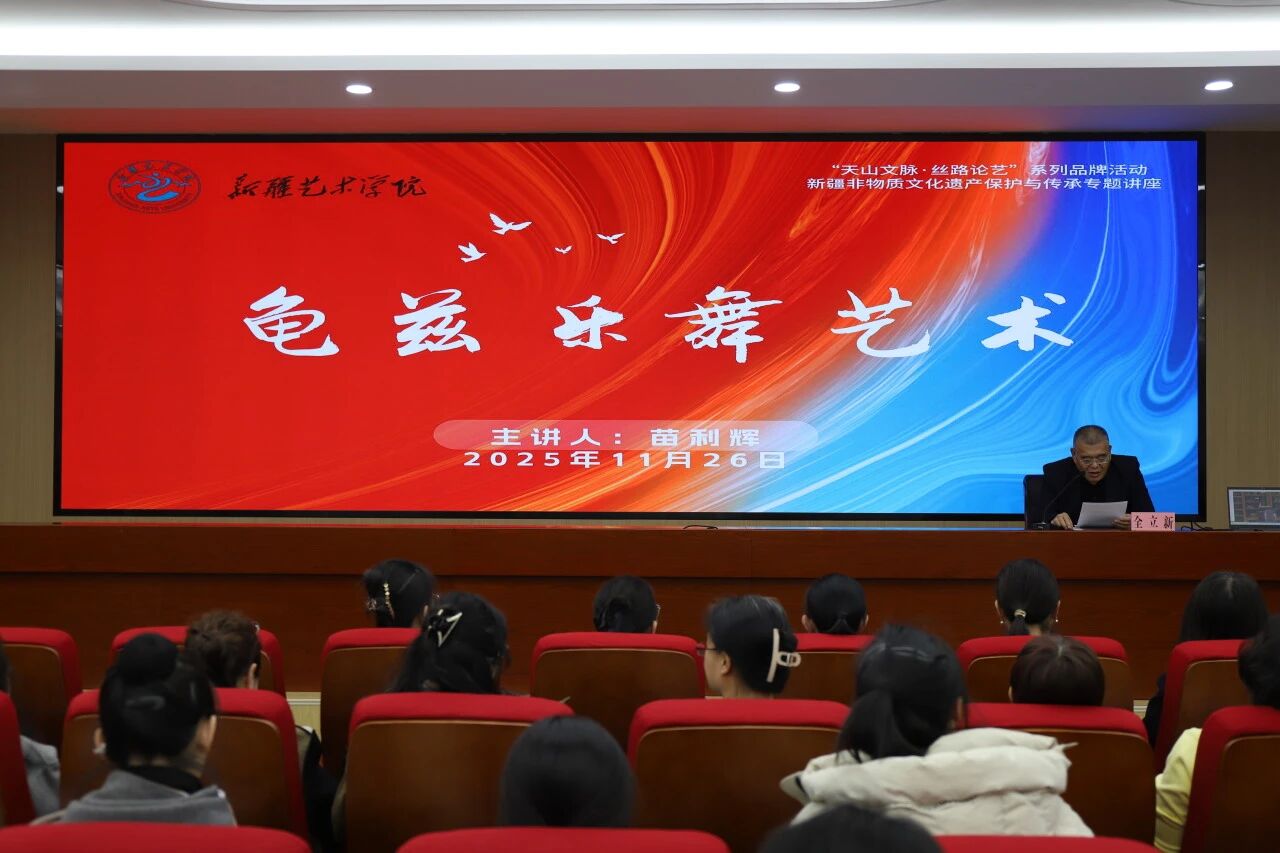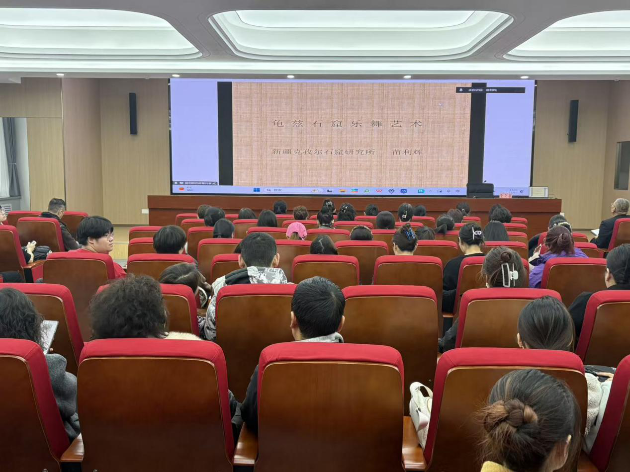 苗利辉研究员紧扣丝绸之路文化遗产保护与传承的时代命题,将研究焦点对准龟兹乐舞这一凝聚多元文明交融互鉴的非物质文化遗产。讲座上,他先系统梳理了龟兹乐舞的历史源流、艺术特征与深层文化价值,再以克孜尔、库木吐喇等石窟遗存中的乐舞图像为实证支撑,层层递进阐释其在东西方文化交流史上的枢纽地位。在此基础上,通过学术研究引领美育实践、美育实践反哺认知深化的双向路径,既夯实了相关研究的学术根基,更助力师生深刻理解新疆多民族优秀传统文化的丰富内涵与当代价值,为该文化遗产的活态传承提供了兼具理论深度与实践温度的探索。
